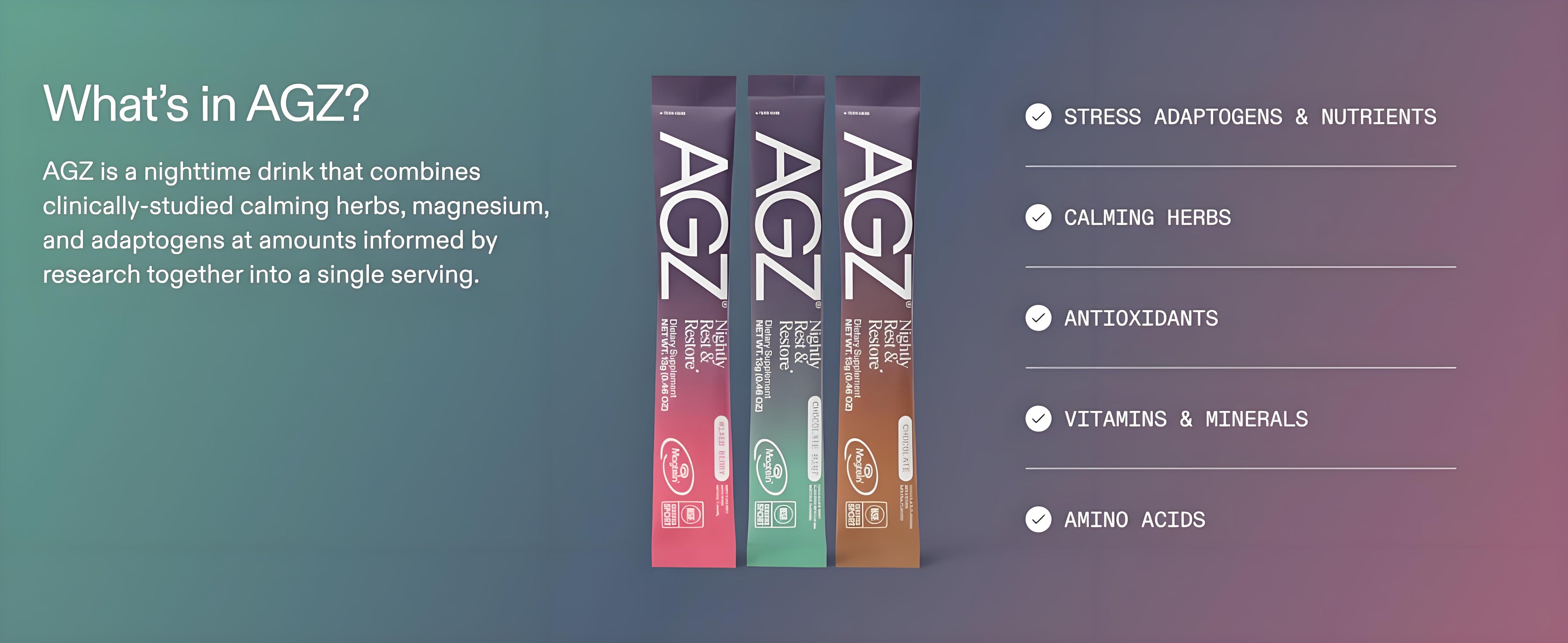 AGZ is a nighttime drink designed to support restful, restorative sleep. With clinically-studied key ingredients including adaptogens, herbs, and minerals, AGZ is a melatonin-free sleep supplement formula designed to improve your sleep quality.* Enjoy cold, room temperature, or warm.