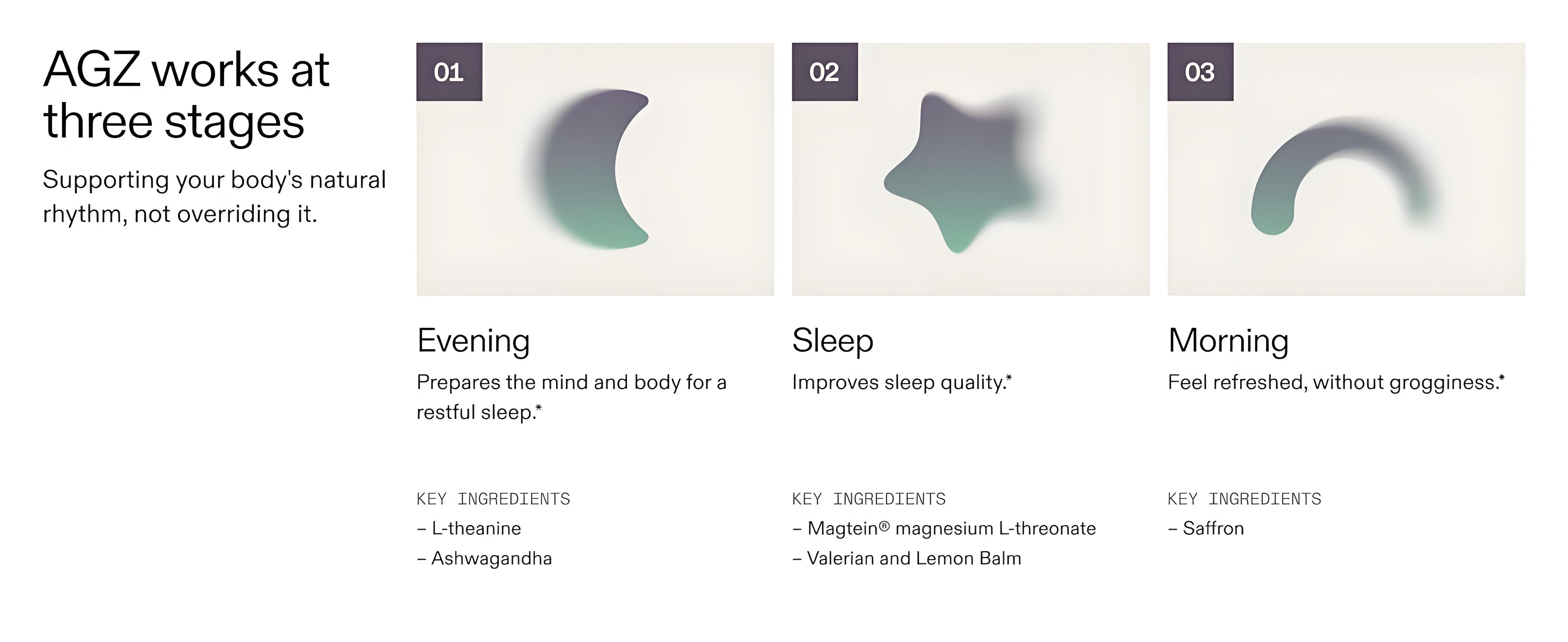 AGZ is melatonin-free formula designed to support the body’s natural rhythm, not override it. The unique blend works overnight to support three phases of rest: